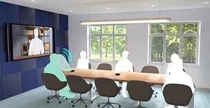 • Photo showing a medium-sized conference room equipped with tabletop array microphones
